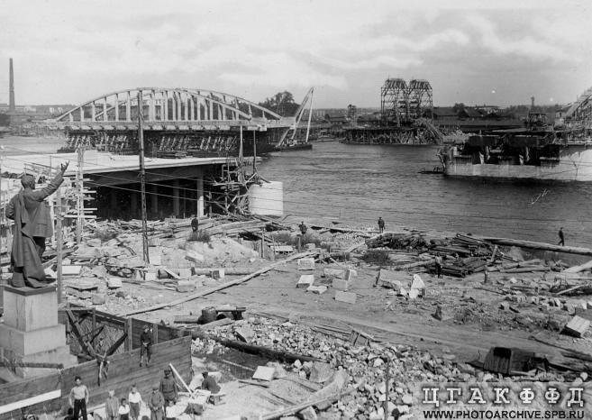 Памятник В.Володарскому (1925, скульпторы М.Г.Манизер и Л.В.Блезе-Манизер, архитектор В.А.Витман) у строящегося Володарского моста (1932-1936, инженеры Г.П.Передерий и В.И.Крылов, архитекторы К.М.Дмитриев и А.С.Никольский) на берегу Невы.