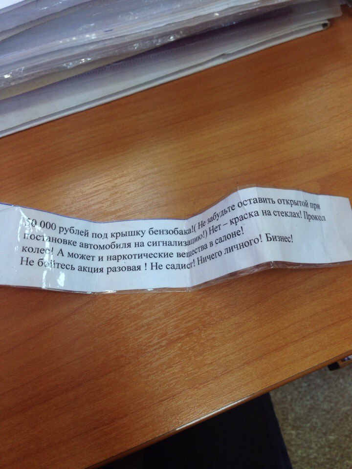 Новости около дома. Такая записка была найдена в ручке дверцы авто. Недалеко от машины ближайшие 3 ночи дежурила собака (поджидала активность возле машины). Деньги кстати, были положены. Точнее, приманка. Вымогатель за деньгами не пришёл (пёс ни разу не лаял).