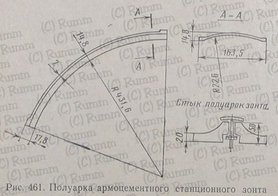 Потом Питерским институтом разработали армоцементные станционные зонты, состоящие из двух полуарок, представляющих собой оболочку двоякой кривизны. Арки опираются на железобетонные или металлические консоли-балки НХ. И являются несущей конструкцией. Кладутся зонты стык в стык.