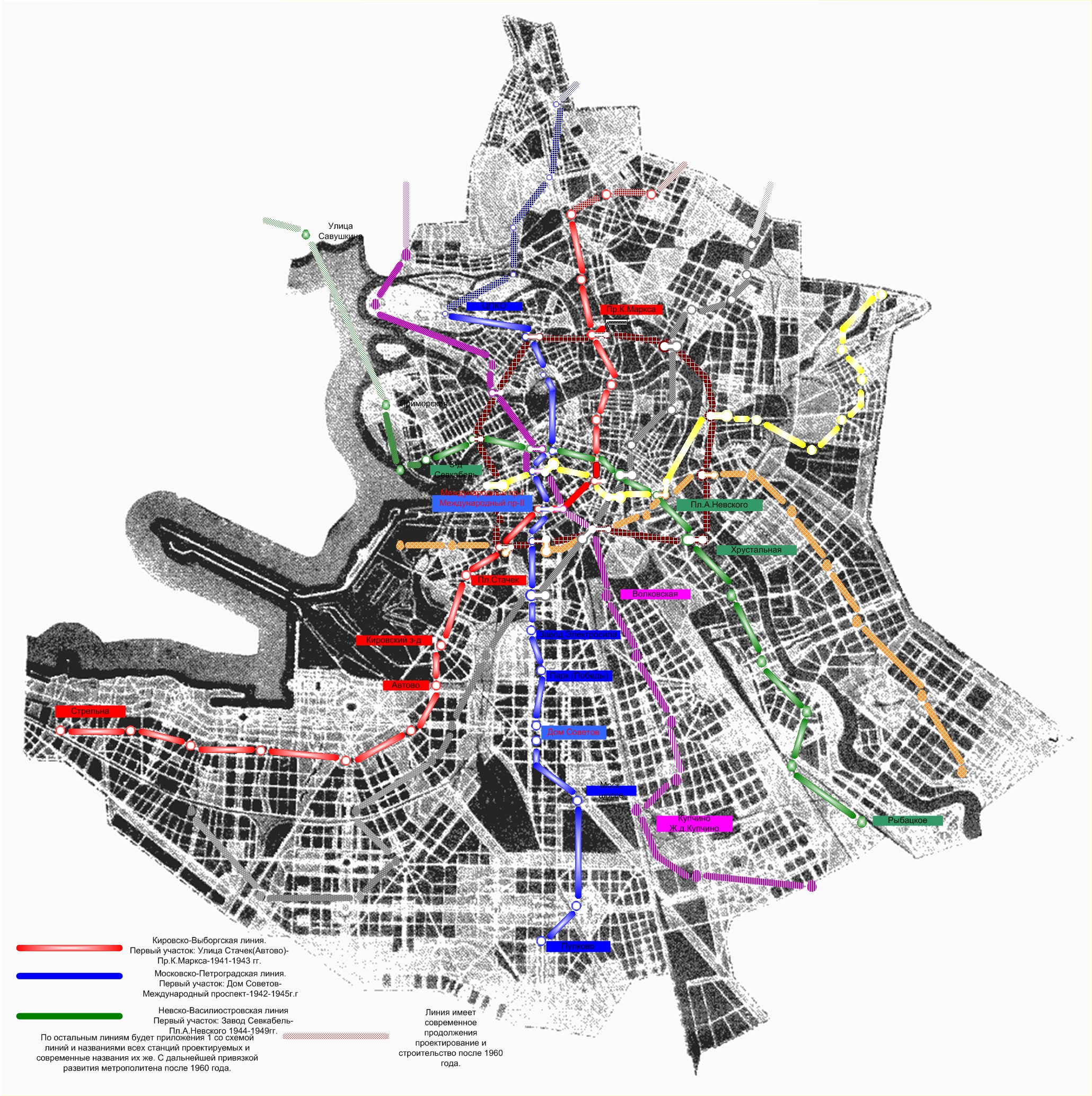 Карта местности это карта 1935 года плана города Ленинграда. Я на нее наложил трассы метрополитена, как они проектировались: