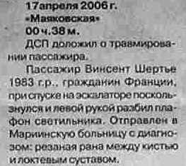 Напомним, 16 декабря при спуске по эскалатору на станции метро «Улица Дыбенко» сорвался и упал на осветительный плафон балюстрады 21-летний житель Псковской области. При этом стеклянный плафон разбился, и молодой человек получил множественные резаные раны различных частей тела, в том числе шеи. От кровопотери и болевого шока несчастный скончался на месте происшествия.