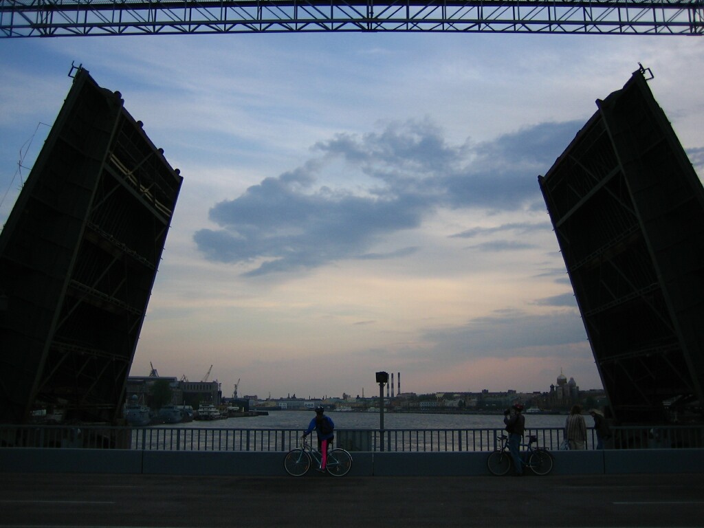 В мае этого года, когда новый мост уже работал, а мост Лейтенанта Шмидта еще не был демонтирован, а просто разведен, они забавно смотрелись вместе.