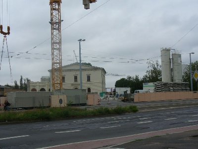 Строительство станции Bayericher Bahnhof, главные ворота вокзала, вид сбоку.