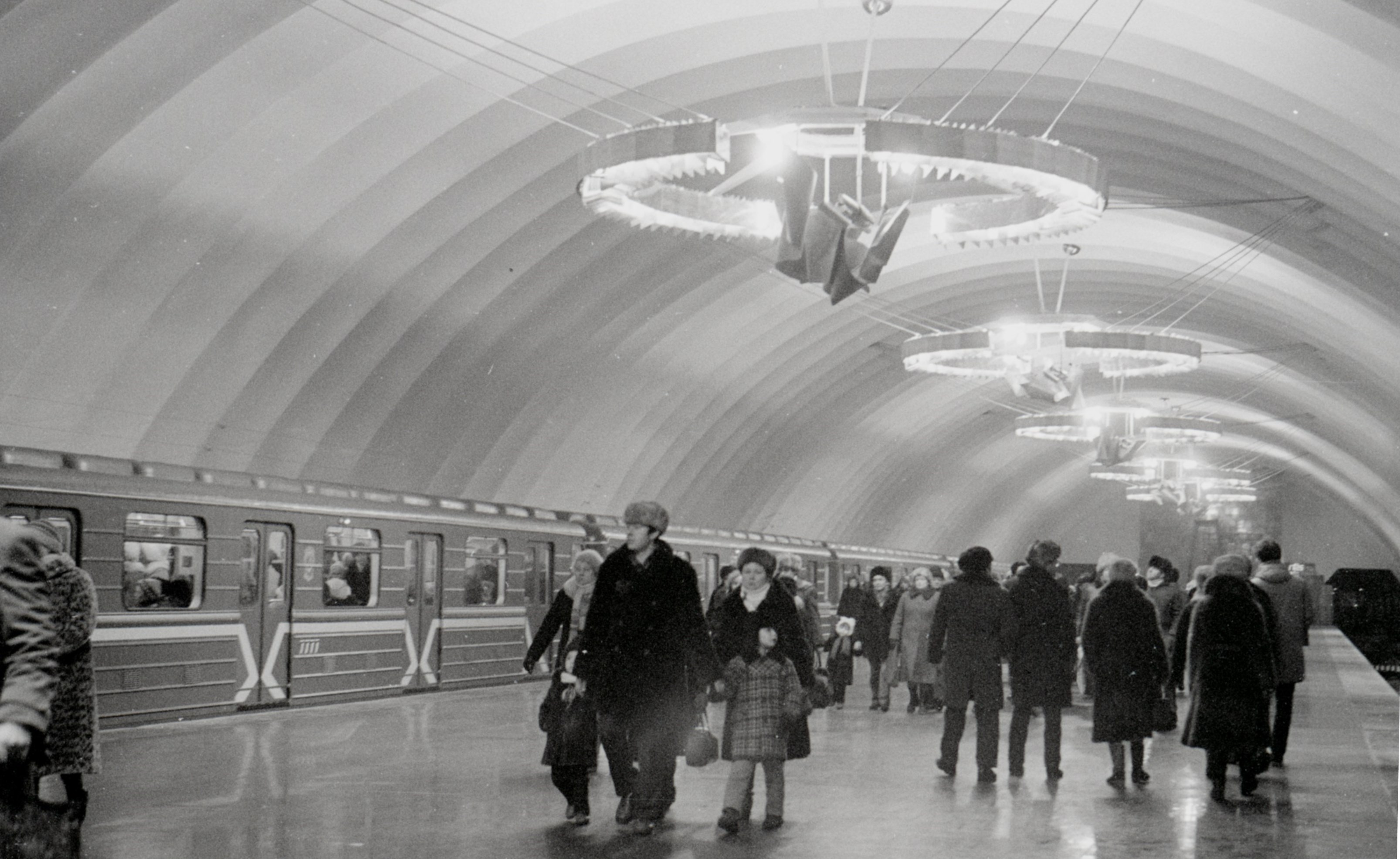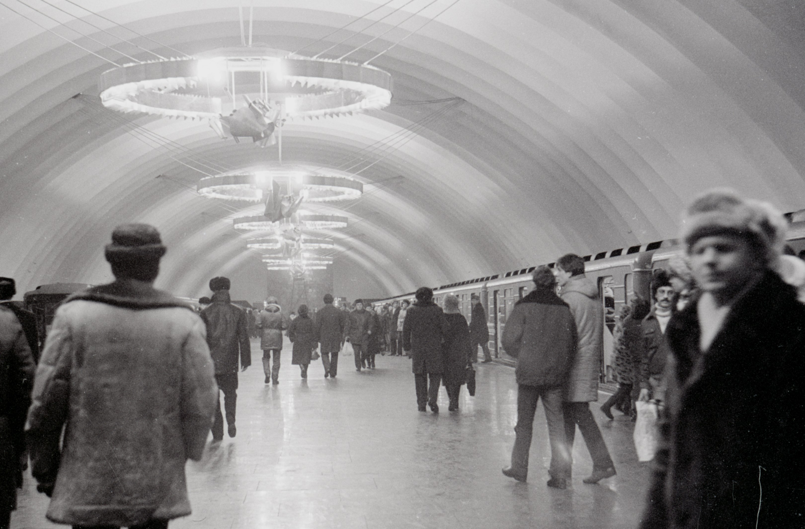 Станция «Красногвардейская» Ленинградского метрополитена со «знамёнами» на потолочных светильниках. Автор фото Михаил Макаренко, 1 августа 1987 года.