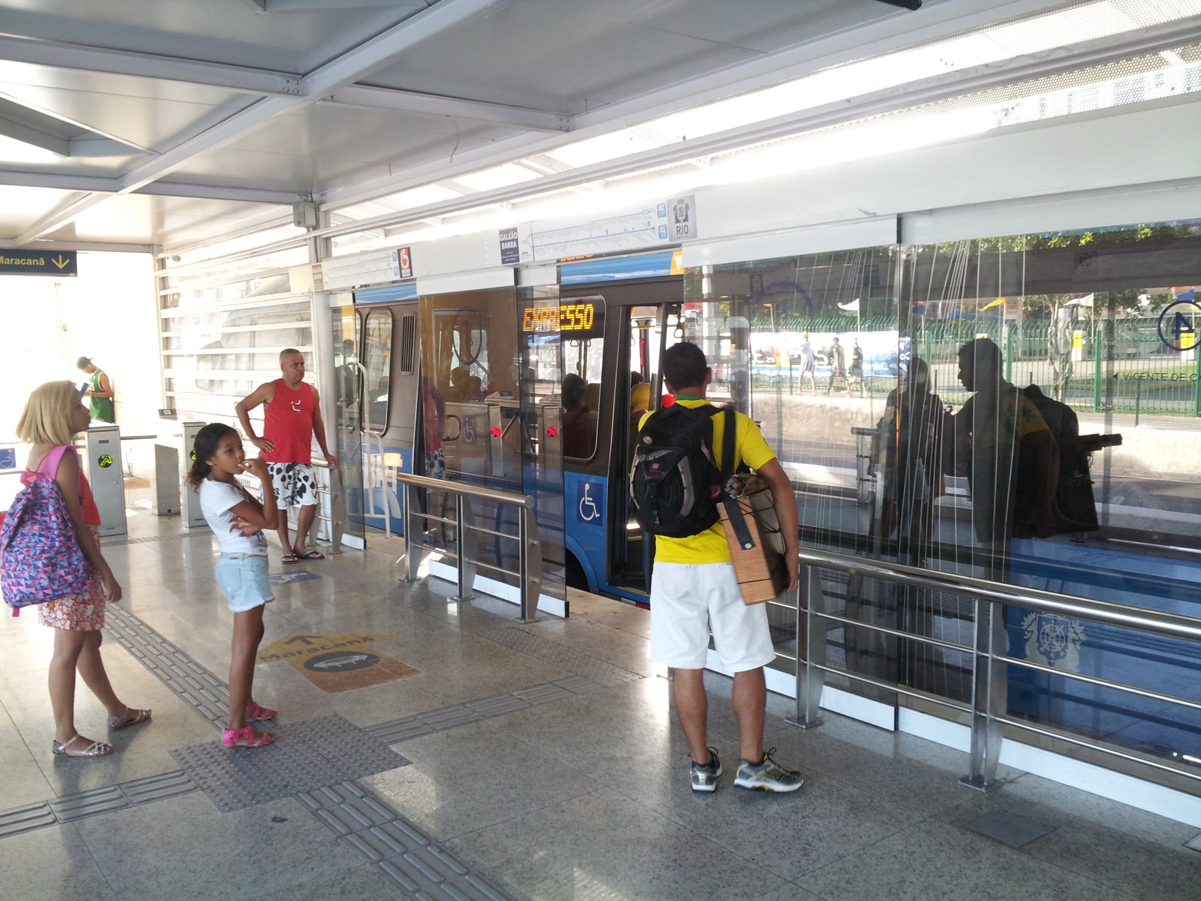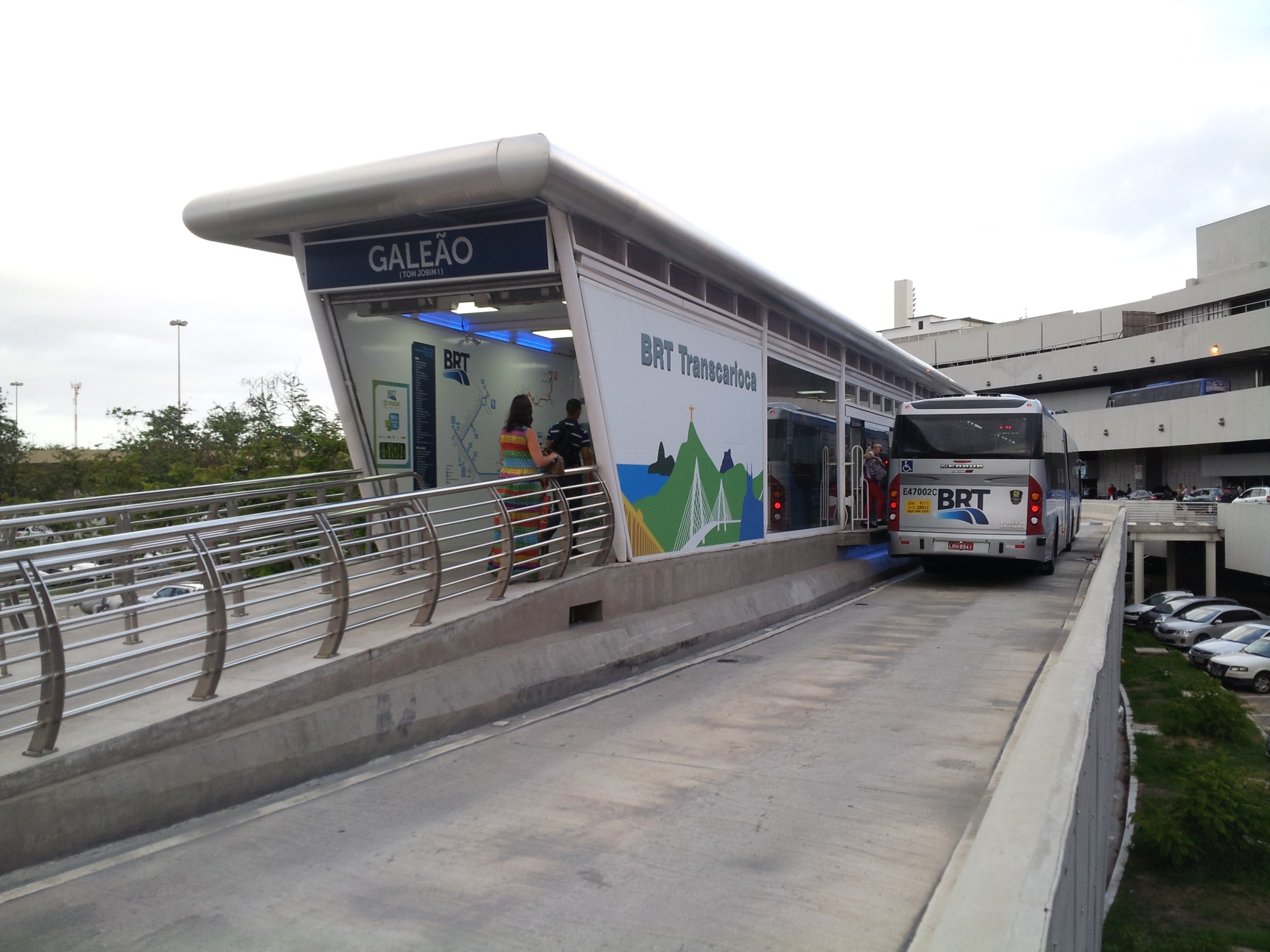 Медународный тоже находится в черте города (на Губернаторском острове, всё в той же бухте), но по дорогам до центра в часы пик можно было ехать часами, движение в Рио плотное. Поэтому к ЧМ-2014 запустили систему BRT (Bus Rapid Transit). Где то выделили полосы на действующих дорогах, где-то построили новые эстакады и путепроводы, где то целые улицы отдали под это дело. Сейчас действуют 2 линии - TransCarioca и TransOeste, к Олимпиаде запустят ещё 3. В общем от аэропорта до ближайшей станции метро получается порядка 20 минут, а по цене метро + BRT (тариф не единый) добраться в центр стало в 2 раза дешевле чем автобусом-шатлом.