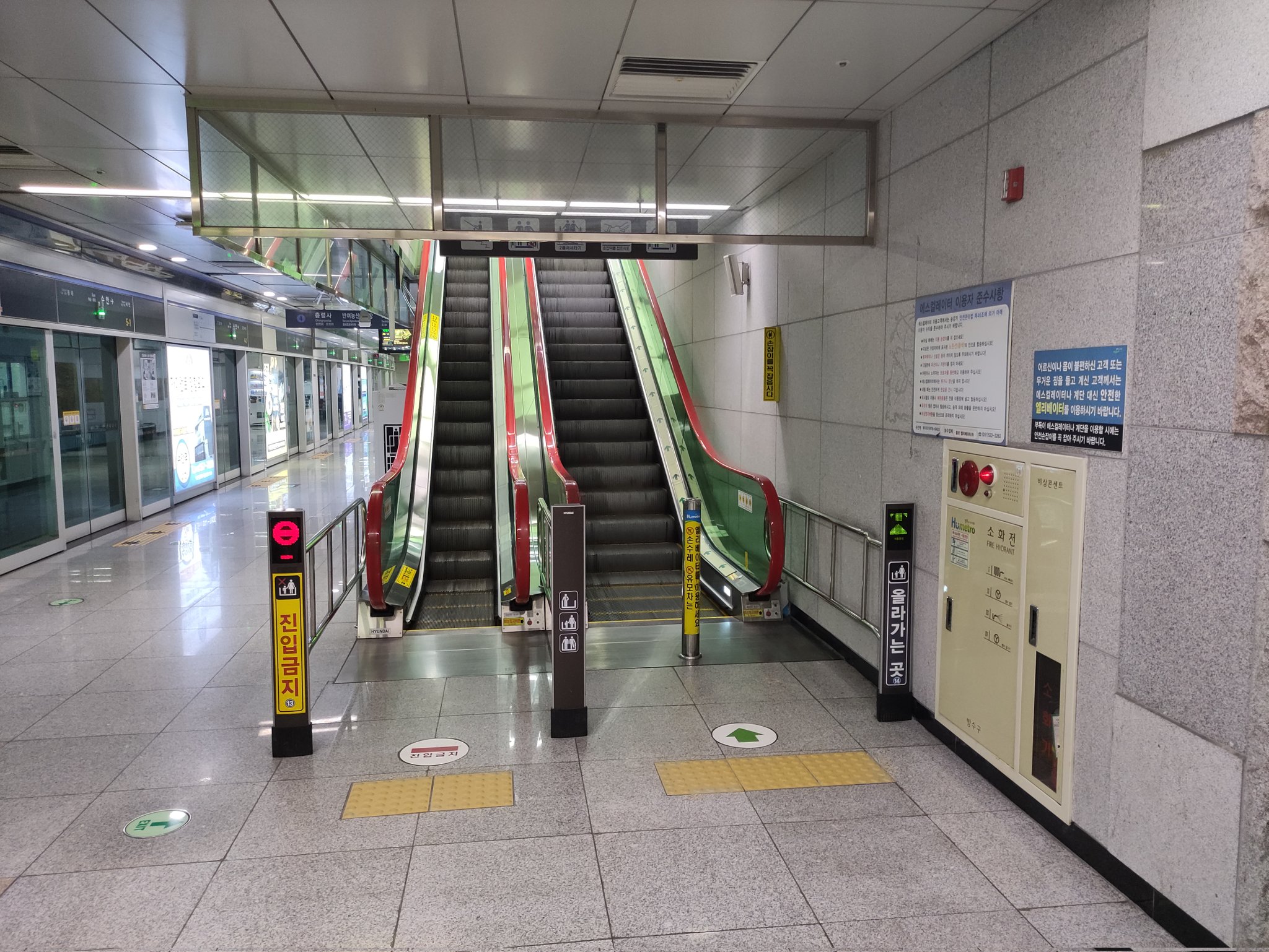 Оптимизация конструкции станции, на примере метро Пусана. Эскалатор на платформу одинарный, а на выход с платформы двойной.