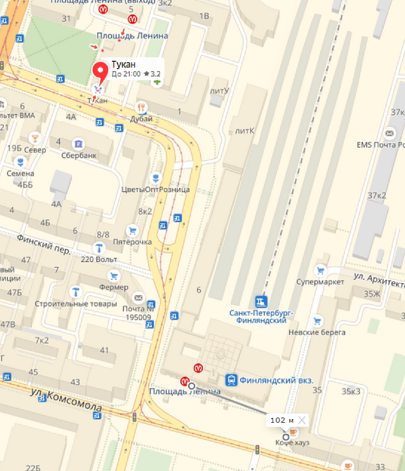 Да, действительно. Потому что станция имеет 2 выхода. Тот, что к ФинБану - ближе КОФЕ ХАУЗ. А у выхода к Боткинской - Тукан.vittoplus писал(а):ст.м. "площадь Ленина" ТК "Тукан" - в самом ТЦ и в бургер кинге при нём.