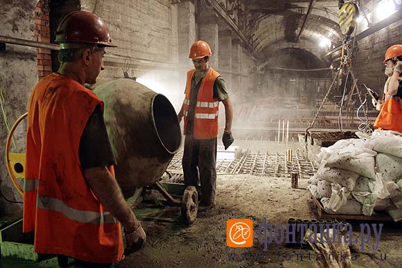 Основная же проблема – подвоз материалов. Уникальность строительства в том, что работы ведутся в действующей части метрополитена, поэтому бесперебойную поставку цемента, воды, кирпича обеспечить невозможно. Трудятся метростроевцы в две смены: ночью и в первой половине дня. После закрытия метрополитена на «Адмиралтейскую» подходит технический поезд, который способен перевезти около 8-ми тонн груза. За ночь такой поезд приходит только один, чего, конечно, недостаточно, - считает Маслак. Еще сложнее тем, кто возводит переходной тоннель – до места работы им приходится почти 3,5 километра добираться пешком, зато материалы можно доставлять круглосуточно на вагонетках. Правда, перевезти каждая может только около 2 тонн. Груз и людей спускают по технической шахте «Звенигородской», откуда стройматериалы, минуя «Садовую», попадают на «второй» уровень «Адмиралтейской».