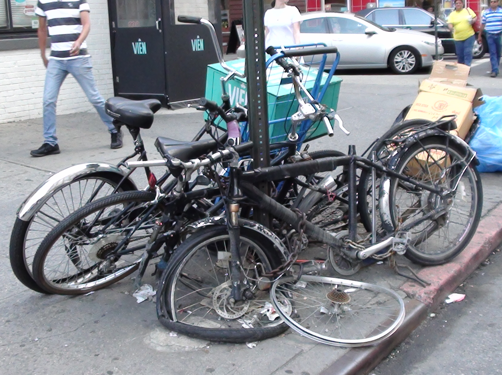 Тут ещё безопасное место (не проезжая часть). В Нью-Йорке паркуют прямо у столбов проезжей части. Водители мусоровозов это не оценят. Велик будет раздавлен и позже разграблен. Ещё чуть позже специальная служба ездит по городу, спиливает замок и велик отправлется на свалку.