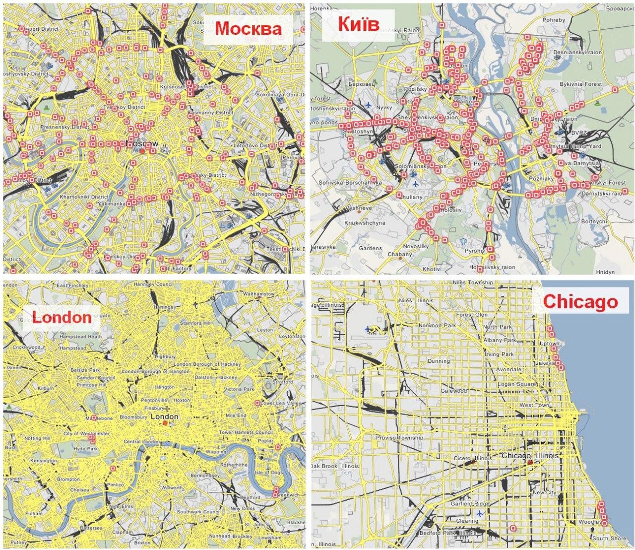 "Прогрессивный" б.СССР и "отсталый" Запад (метки - внеуличные переходы в городах)