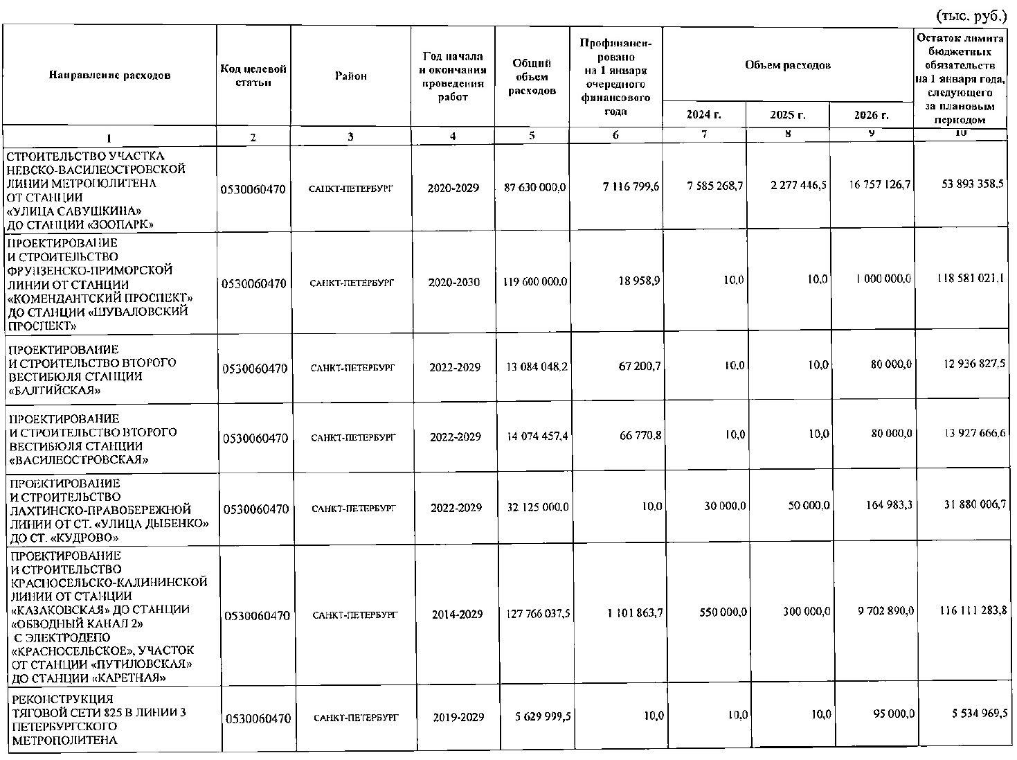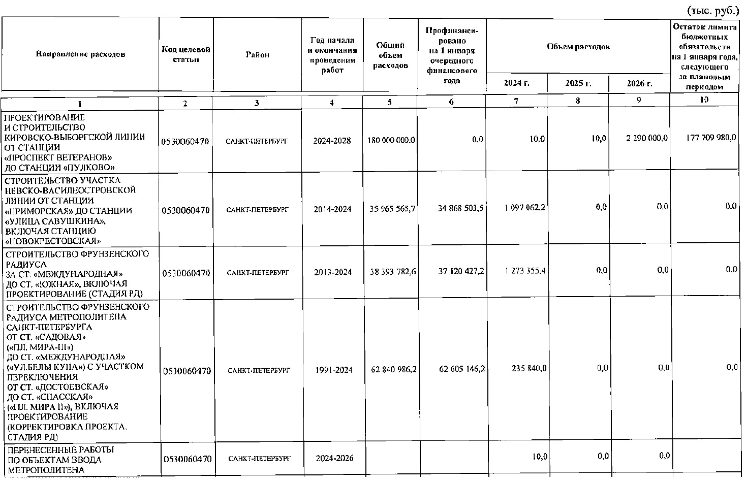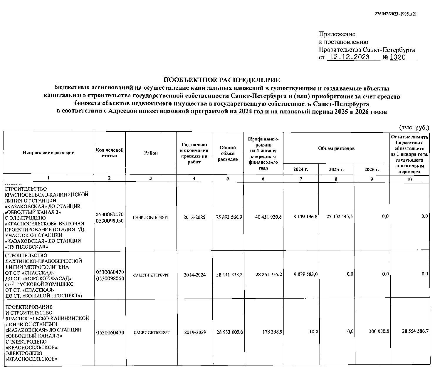 Собственно Адресная инвестиционная программа на 2024 год и на плановый период 2025 и 2026 годов, утвержденная постановлением Правительства Санкт-Петербурга от 12.12.2023 № 1320, в части, касающейся строительства и проектирования метрополитена: