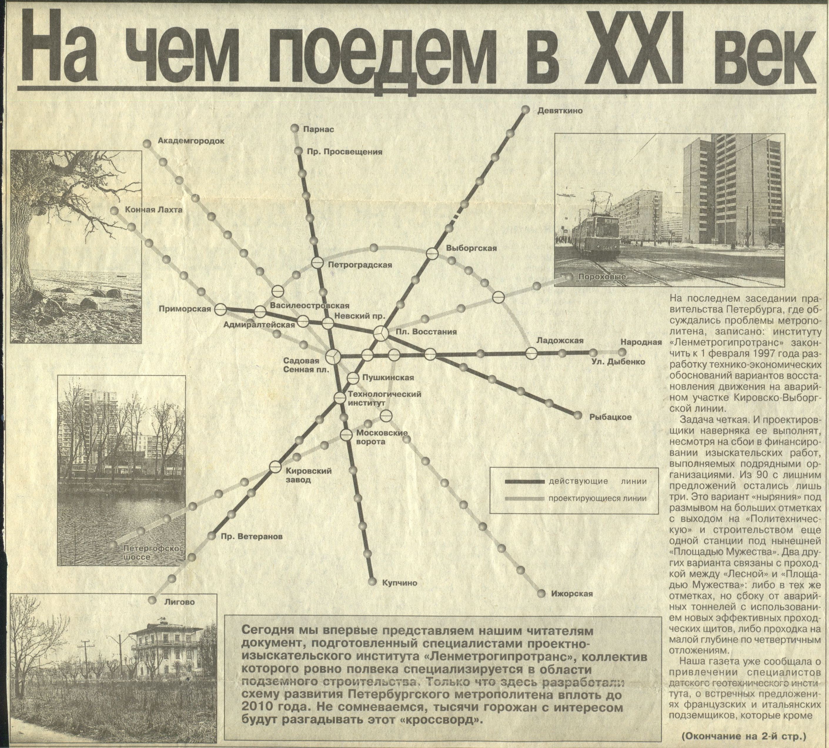 Недавно нашел у себя вырезку из газеты "Санкт-Петербургские ведомости" за декабрь 1996 года (более точной даты не сохранилось), в которой опубликована схема развития метрополитена до 2010 года. 2010 год на дворе - смотрим и видим, что сделано, а что нет... По-моему, не сбылось даже четверти того, что планировалось сделать к сегодняшнему дню. Прошло 13 лет с момента публикации, соответственно можно сделать выводы и переложить ситуацию на нынешнюю схему развития до 2020 года - думаю, через 10 лет планы и реальность будут расходиться примерно так же...