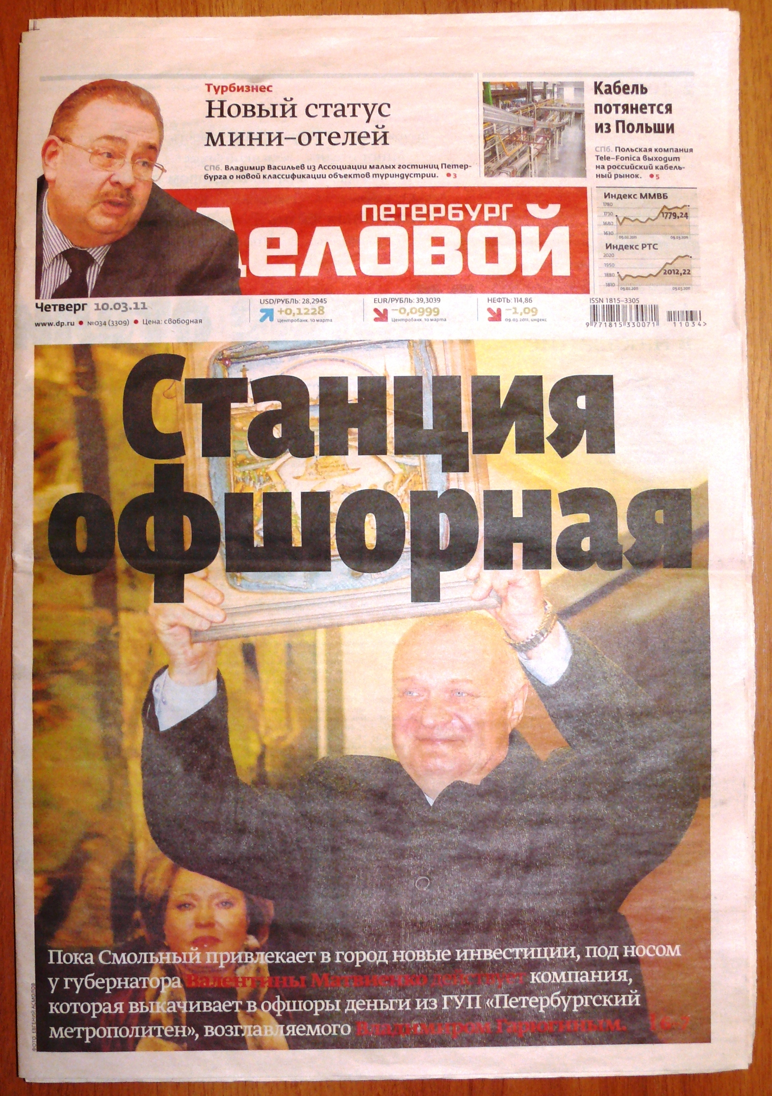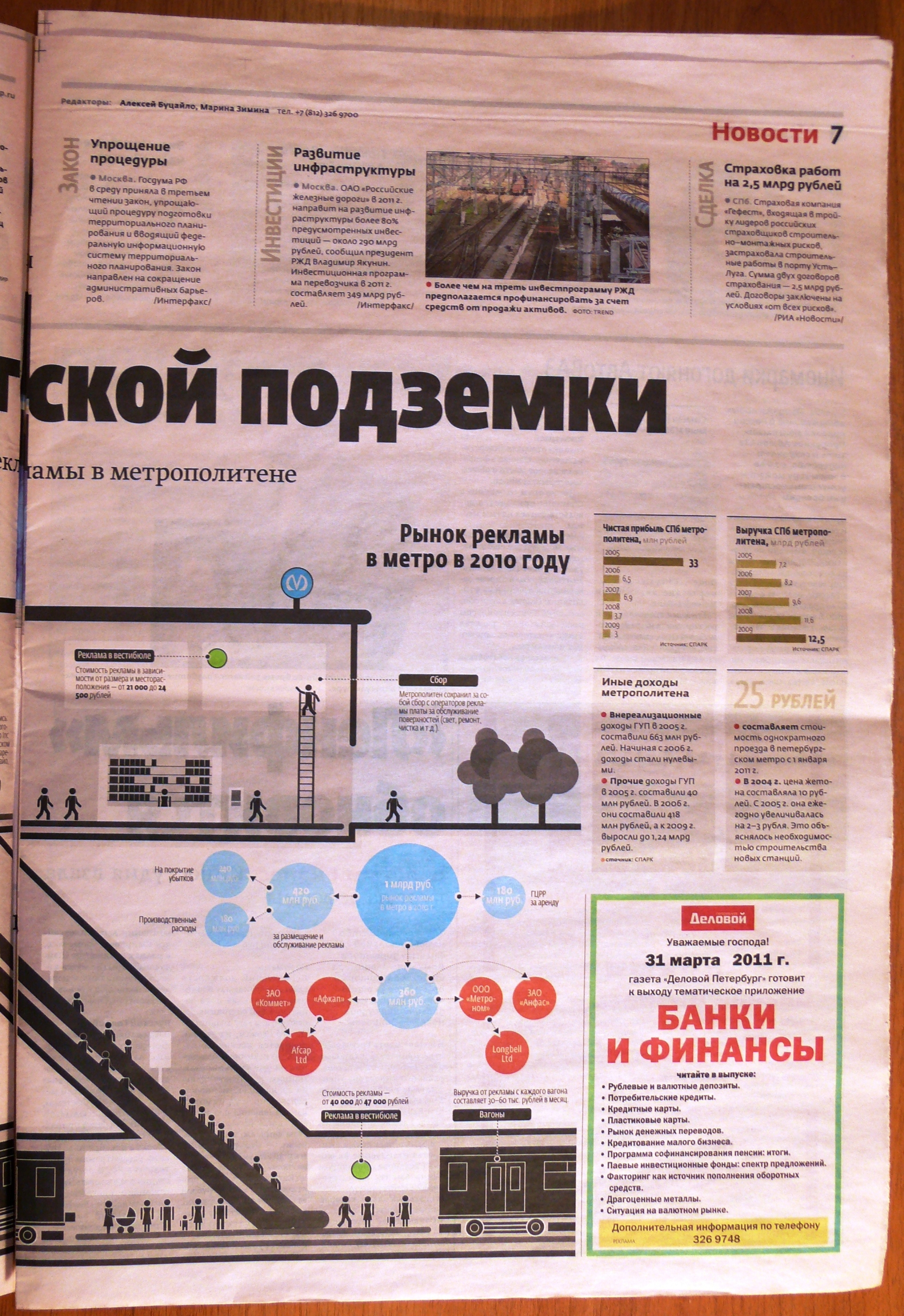 В сегодняшнем "Деловом Петербурге" №034 (3309) опубликована статья "Станция офшорная". Целый разворот посвящён размещению рекламы в метрополитене. Статья прямо направлена против Гарюгина. Правда, в статье есть опечатки, неточности, что для "ДП" обычно не свойственно. Похоже, материал делали в спешке.