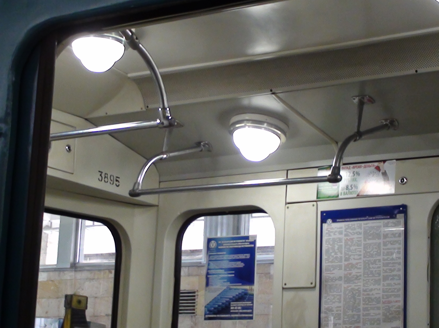 И вот, наконец, третья серия модернизаций - с салоном от ЛСК. В целом, мне нравится, что он хорошо отражает свет - лучше, чем салон ВМ. Симпатичные решётки под динамики. Светодиодное освещение - свою задачу решает, но на мой взгляд является лишь дополнительным ухищрением для того, чтобы выдать старый вагон за новый. А вот вентиляция сделана отвратительно. Грубые плоские накладки, зазоры вразнобой - выглядят как инородный элемент. Как бы, сразу видно, что этот салон предназначен для установки на продукцию ОЭВРЗ. ВМовский салон в этом плане на голову выше (хотя там эти накладки хлипковаты и болтаются при движении - дизайн у них лучше). Я считаю, зря этот салон ставят в вагоны, выпущенные на заводе имени Егорова. Это все равно, что в "Волгу" 3110 поставить приборную панель от ВАЗовской "шестёрки".