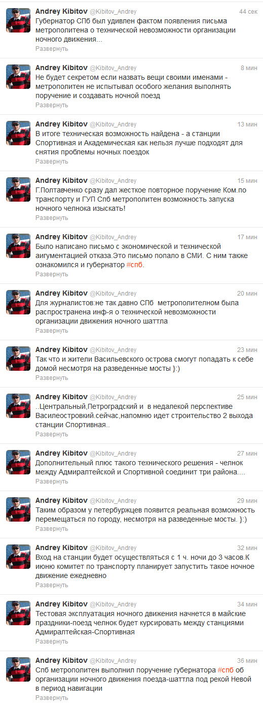 Пресс-секретарь Губернатора СПб - Андрей Кибитов - уже разродился массой сообщений в своём твиттере на тему ночных поездов в метро. Скриншот (нажмите, чтобы увеличить изображение):