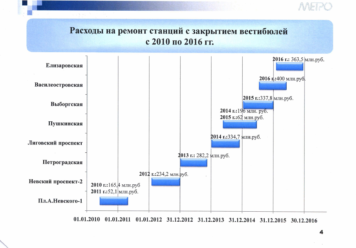 Расходы на ремонт станций с закрытием вестибюлей с 2010 по 2016 гг.
