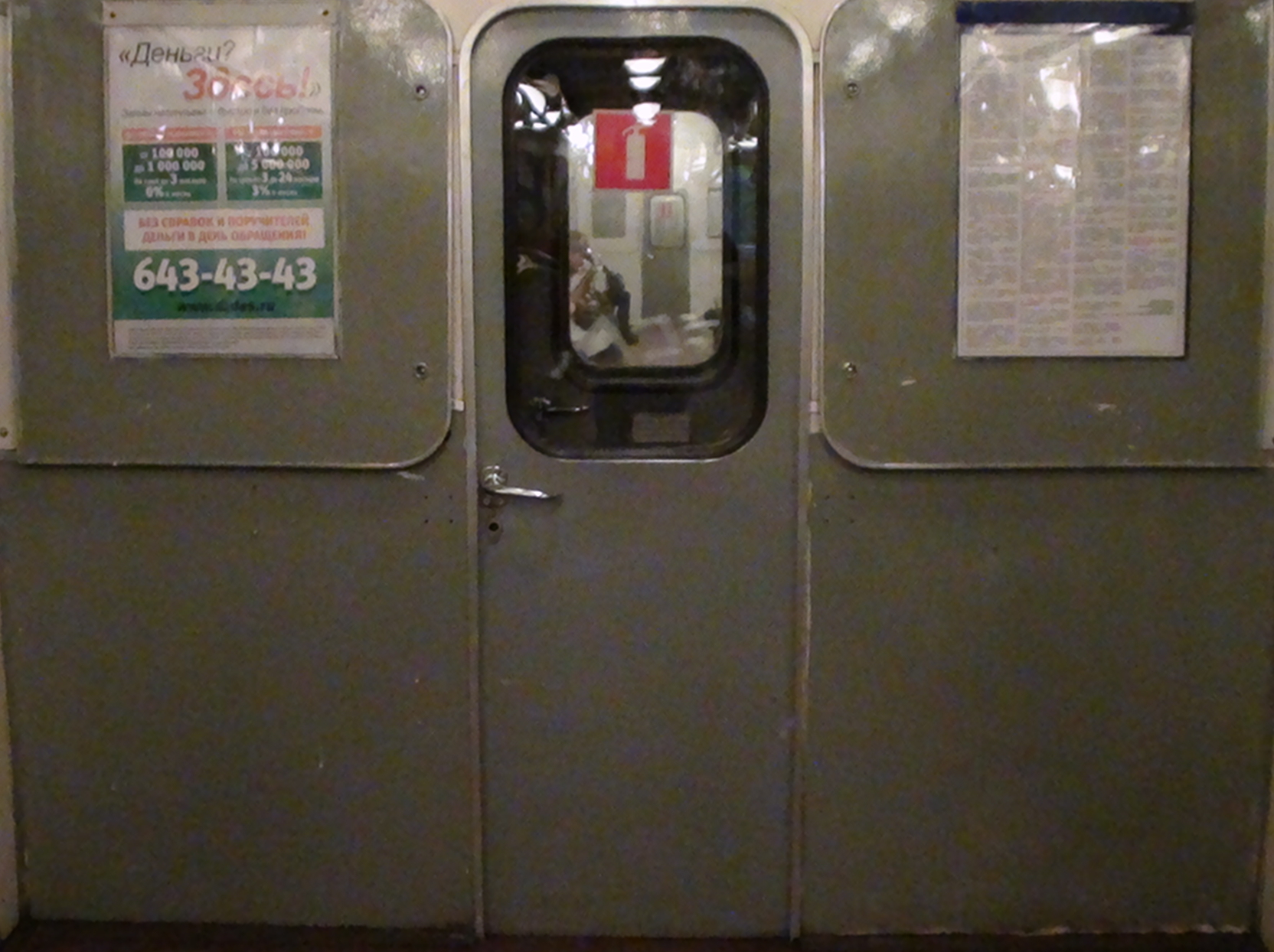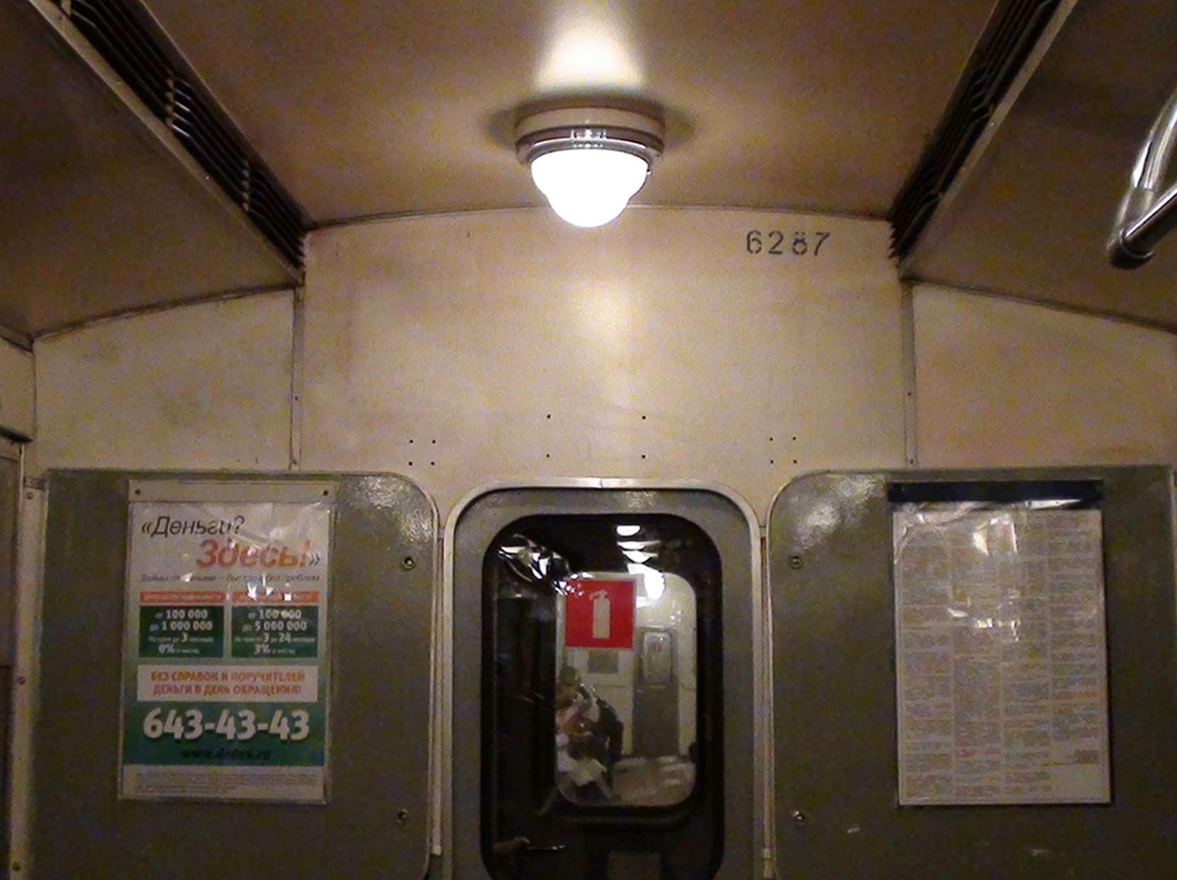 Сегодня ехал как раз в вагоне, про который говорил в другой теме - 6287. Вагон примечателен тем, что кабинный торец покрашен в серый цвет - такое можно встретить только в Емах на НВЛ. В некоторых Емах на НВЛ так же, красят торцы, но в этом вагоне рекорд - ещё и стены по краям обеих сторон кабины (на фото только одна сторона).