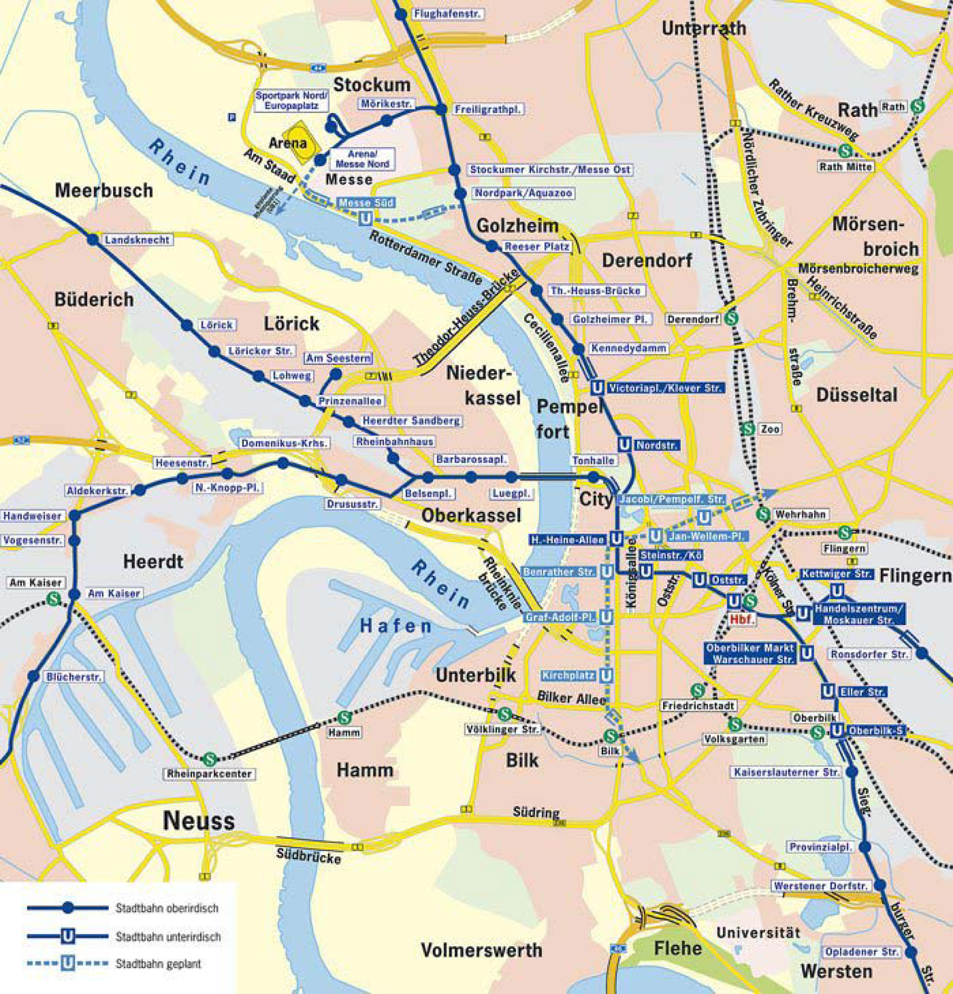 Полноценного метрополитена в Дюссельдорфе нет, трамвайная сеть U-Bahn, проходящая под землёй в центральной части города, выглядит следующим образом: