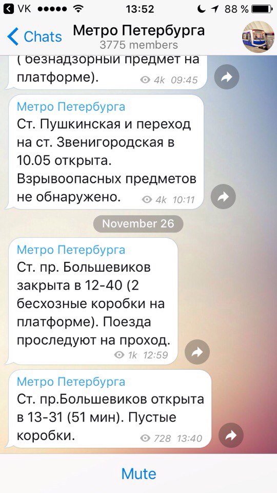 У Петербургского метрополитена появился официальный канал в приложении обмена мгновенными сообщениями «Телеграмм», на котором будет публиковаться оперативная информация, в том числе и о закрытии станций из-за обнаружения бесхозных предметов или в связи с чрезвычайными ситуациями, а также об их открытии после проверки.