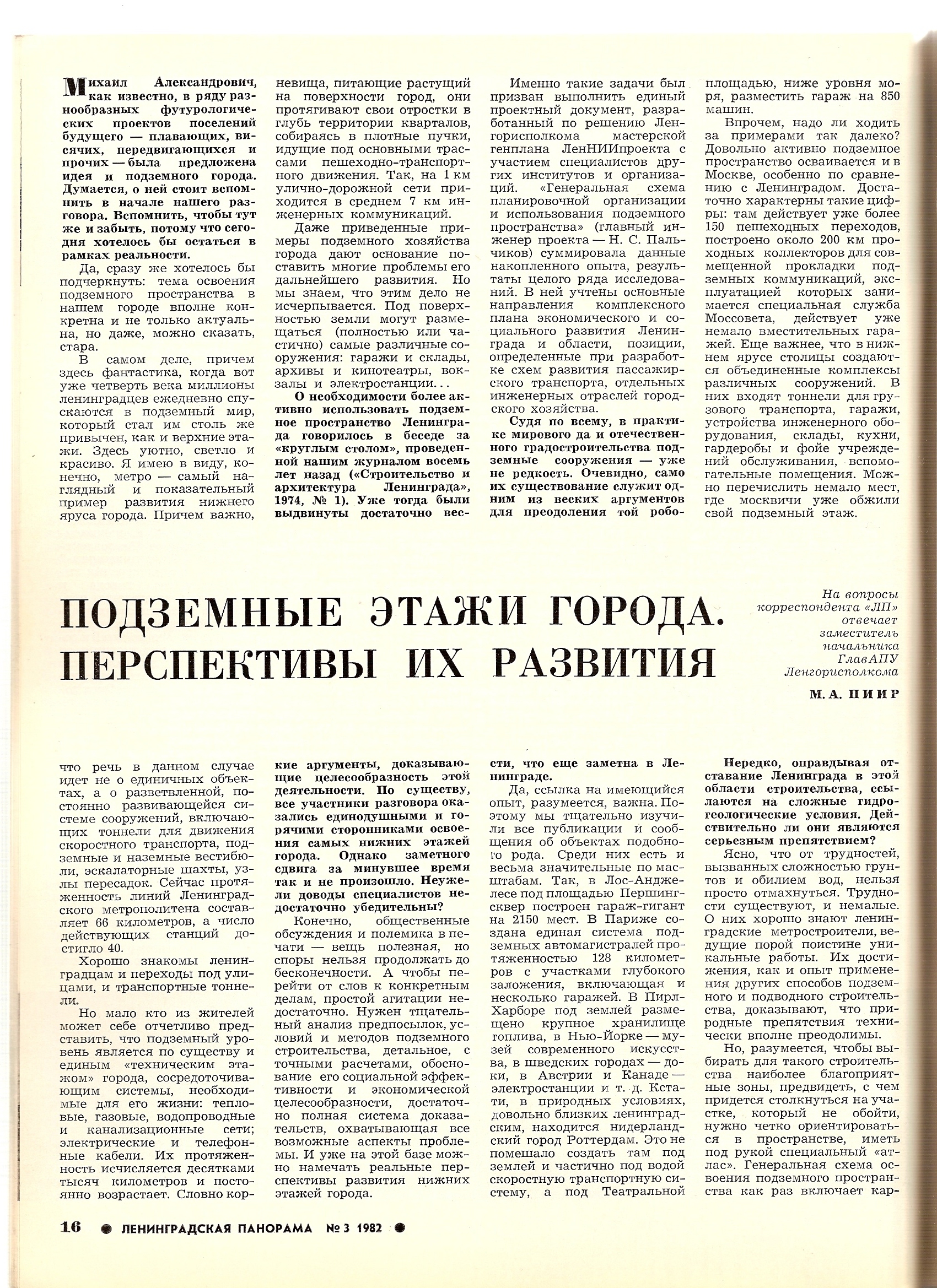 Статья "Подземные этажи города. Перспективы их развития" из журнала "Ленинградская панорама" №3 1982г.