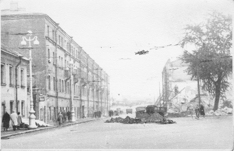 На втором фото даже не май 44-го, а по меньшей мере осень... это если судить не только по троллейбусу, но и по одежде прохожих и плакату. По логике вещей решение восстанавливать разрушенные здания могли принять только после того, как оттеснят противника подальше от города, в т.ч. с Карельского перешейка, а это как раз было летом 44-го.