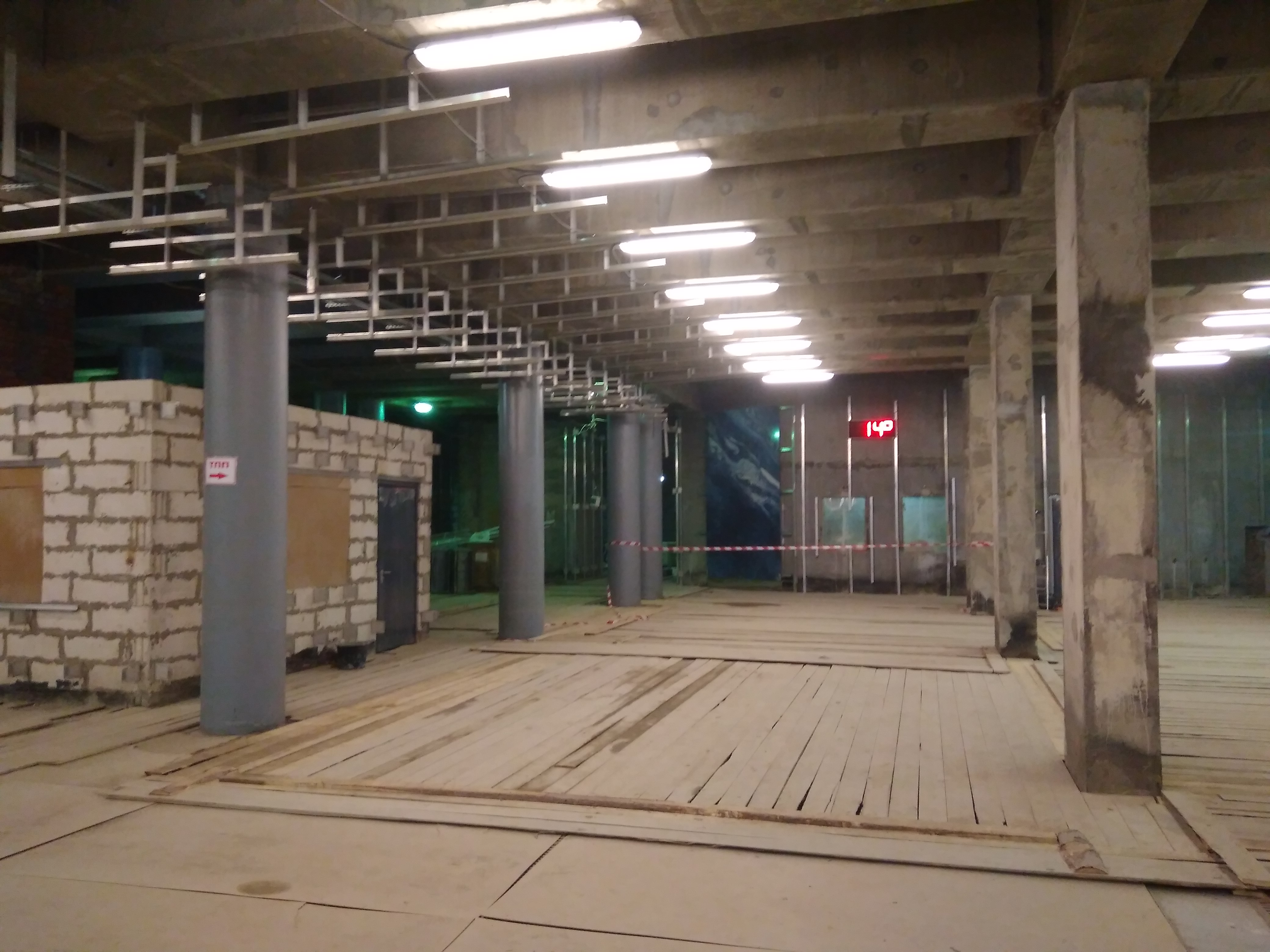 80% площади – служебные помещения, за исключением участка ТПП и переходной площадки на отметке +5. Здесь тоже «все кипит»: установка межкомнатных перегородок, шпаклевка, штукатурка, окраска, монтаж дверей и т.д. На этом перекрытии тоже активно ведется прокладка инженерных сетей, в том числе