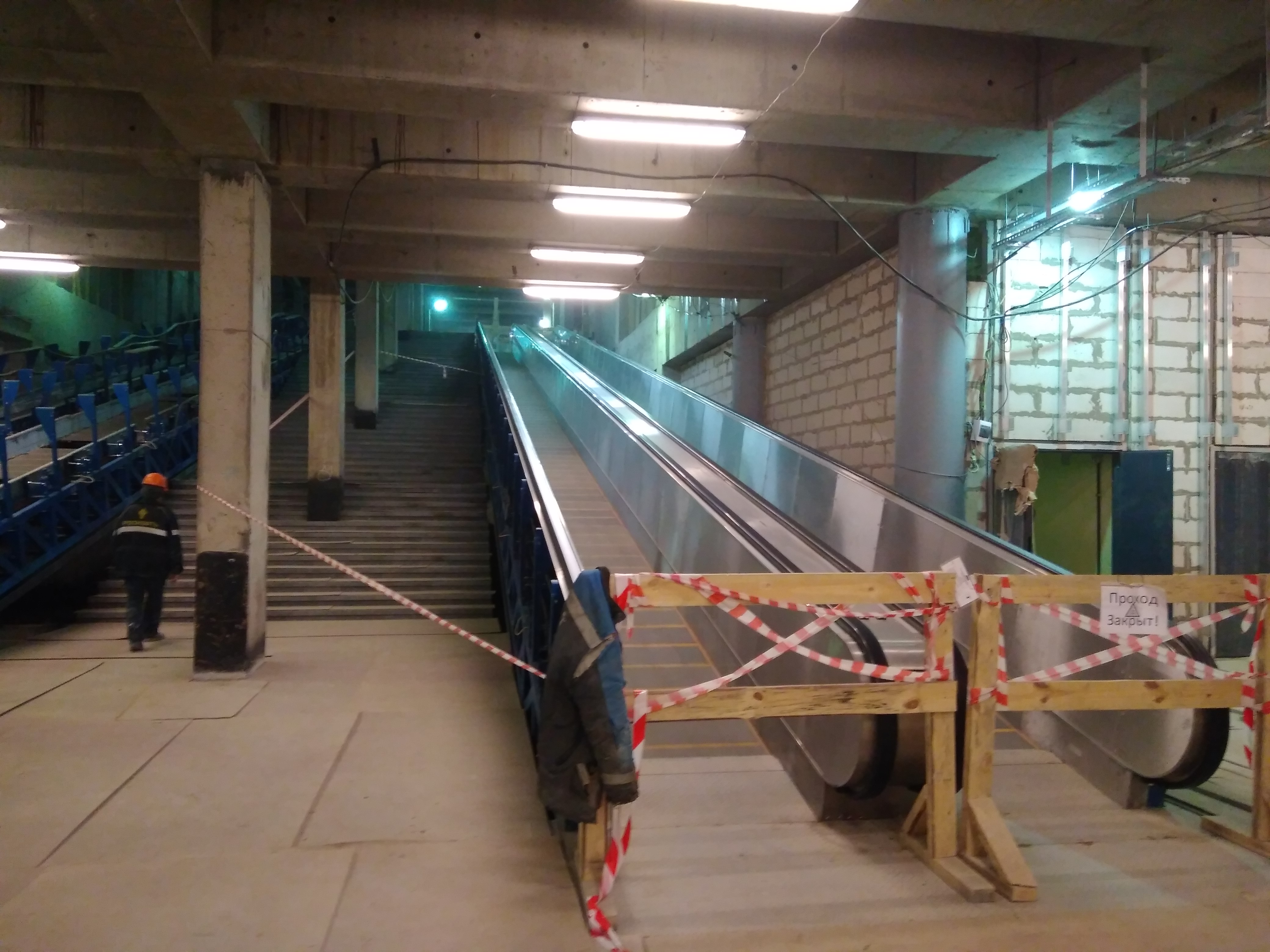 Перекрытие на 9.900 – это и монтаж оборудования тягово-понизительной подстанции (ТПП), и устройство вентиляционных узлов, отделка львиной доли служебных помещений и кассового зала, это, наконец, эскалаторные спуски. На станции всего 12 эскалаторов и восемь эскалаторных зон. Из 12 машин в проектное положение установлено 10. Кое-где эскалаторы стоят в паре, а где-то установлены одиночные. К Новому году все эскалаторы займут свои места на станции. Сейчас идет наладка эскалаторных систем.