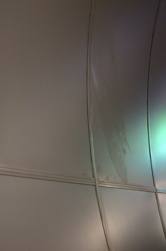 Первые следы появились ещё три недели назад, однако работники метрополитена оперативно устранили их, попросту затерев современный материал «алполик», а прокорродировавшие профили немного подкрасив. Однако вода всегда дырочку найдёт, и теперь характерные ржавые подтёки видны уже в четырёх местах наклонного хода. Один отчётливо виден при выходе со станции, а три других - если смотреть на свод при спуске.