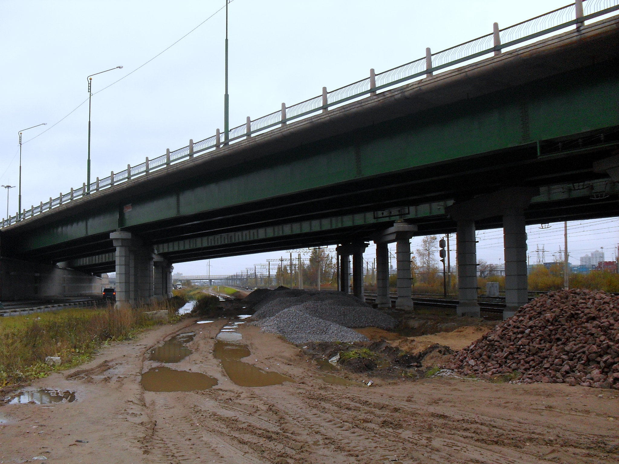 В последние недели на новой МОЖД активизировались строительные работы. От 16 км в сторону Пушкина расчистили от снега и верхнего слоя грунта полосу длиной около километра, сразу покрыв примерно метровым слоем песка. Там же завезли ж/б короба для дренажа. Такие же короба появились и ст. метро Купчино.