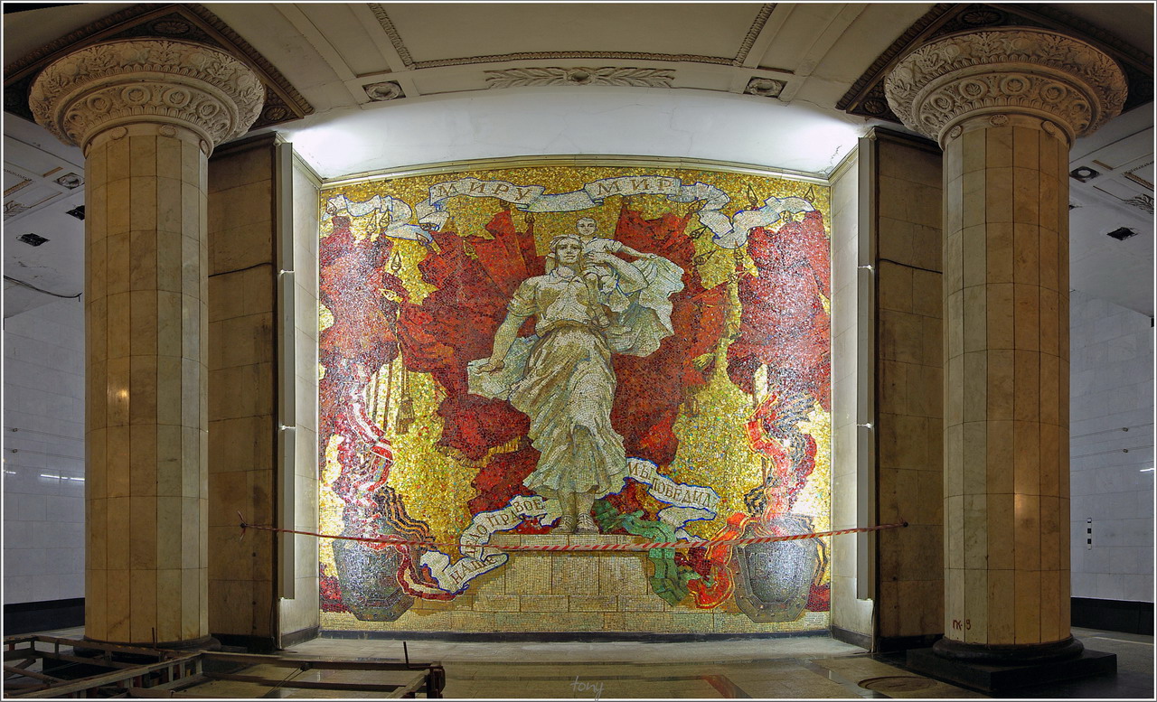 Другие мозаичисты, которые работали в метрополитене - группа ФОРУС - творили гораздо разнообразней. С годами их стиль менялся (помимо мозаик в метро, они создали много интересных и разнообразных произведений в городе). А у Быстрова стандарт - "групповое фото" (авиаторы, Семёновский полк, основатели Адмиральтейства). Или, например, повторение композиции с ПЛАНа-2 в вестибюле Звенигородской, причём с упрощением проработки деталей.
