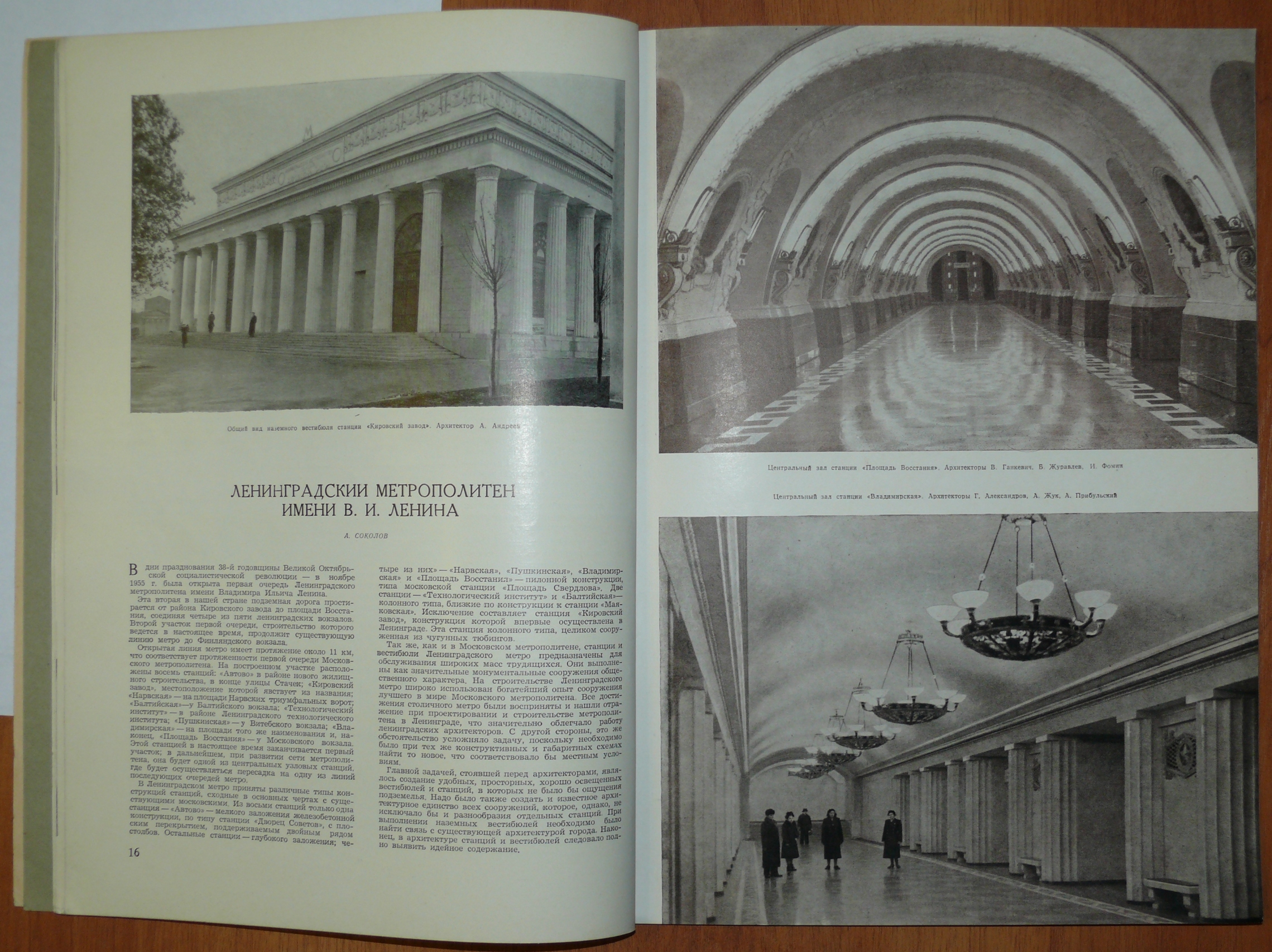 "Архитектура СССР" - одно из главных, если не главное, периодическое издание об архитектуре в то время в нашей стране. И, естественно, что журнал не мог обойти стороной тему архитектурного оформления первой очереди метрополитена Ленинграда. Первая статья была написана А.М. Соколовым (приведена в моём предыдущем сообщении), и она по сути описательная, а не критическая. Это объяснимо, ведь автор - главный архитектор метрополитена, а также соавтор станции "Технологический институт".
