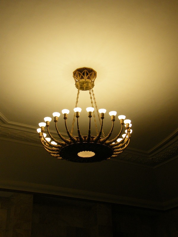 Не могу не заметить, что и Киевскую (все Киевские) затронула бессистемная замена/удаление элементов убранства. Во иллюстрацию - та же люстра, где в верхнем ряду поставлен совершенно левый плафон.