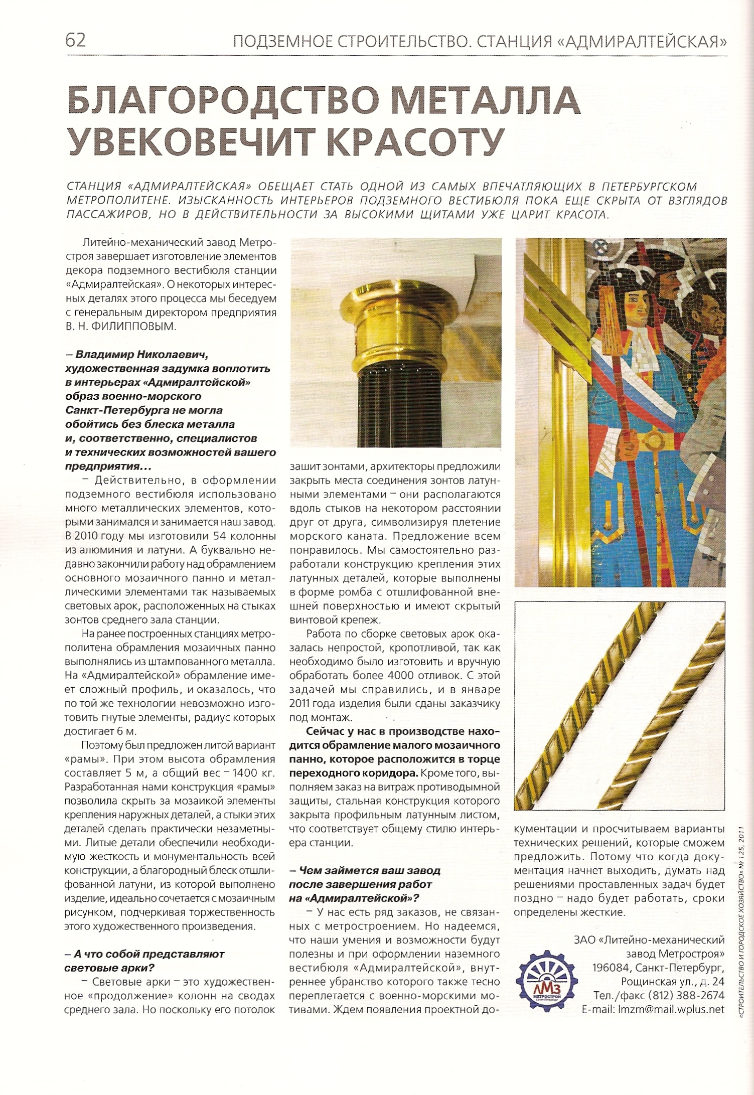 В статье "Подземное строительство. "Адмиралтейская" - о строительстве НХ, архитектурной отделке "Адмиралтейской", немного о работах на станциях "ПЛАН-1" и "Автово".