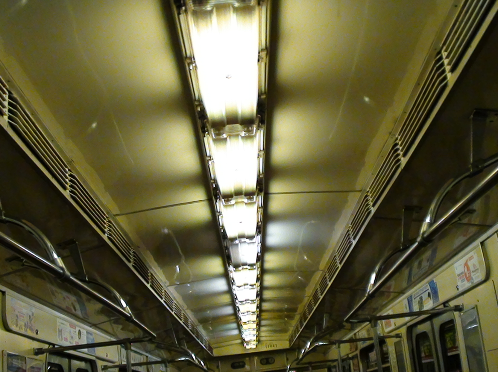Светильники модели ЛВВ-01. Устанавливались штатно с 1990 по ~2002 год. Специально разработаны для применения в железнодорожных вагонах и вагонах метрополитена [*]. Имеют два режима работы и три лампы: две люминесцентные на 20 Вт для основного режима, и одну ЛН с допустимой мощностью до 60 Вт для режима аварийного освещения. Если мне не изменяет память, требуют другого питания, нежели традиционные "номерные" светильники, ставившиеся раньше - 110 В постоянного тока. Ввиду этого на вагоны, в которых установлены такие светильники, устанавливался другой низковольтный блок питания, а не стандартный БПСН. С завода (по крайней мере, для нашего города) светильники комплектовались лампами типа ЛТБ, которые имели более комфортную для человеческого глаза цветовую температуру (около 3000 К), улучшенный спектр освещения (Ra где-то 70, против где-то 60 у стандартных) но при этом меньший световой поток. Поэтому и запоминались - главным, образом из-за этих особенностей. А, ещё рассеиватель у них современного типа, из прозрачного рифлёного поликарбоната, что давало более оптимальную КСС по сравнению с традиционными светильниками. Свет у них такой... бело-розоватый слегка :) В общем, странный немного, но интересный!