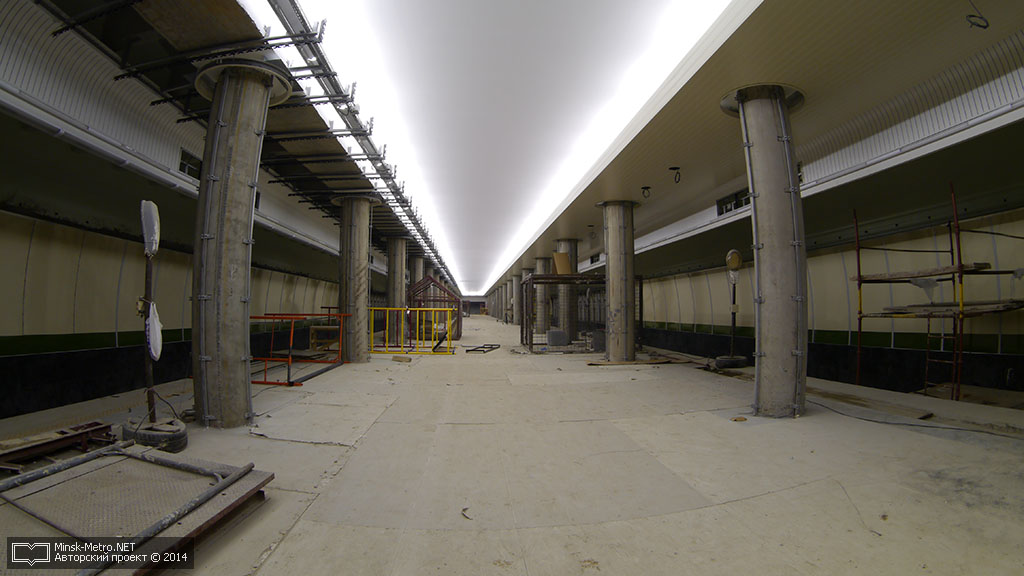 Готовность станционного комплекса достаточно высока, однако, оставшийся объем работ не вселяет оптимизма и не оставляет надежд на пуск станции в мае 2014 года. В настоящее время широко развернуты отделочные работы: на значительной площади платформы и вестибюлей уложен гранит, частично облицованы плиткой стены вестибюлей, активно облицовываются и путевые стены станции. Ведутся работы по монтажу конструкций подвесного потолка. Степень завершенности отделочных работ и темпы их выполнения можно назвать весьма высокими.