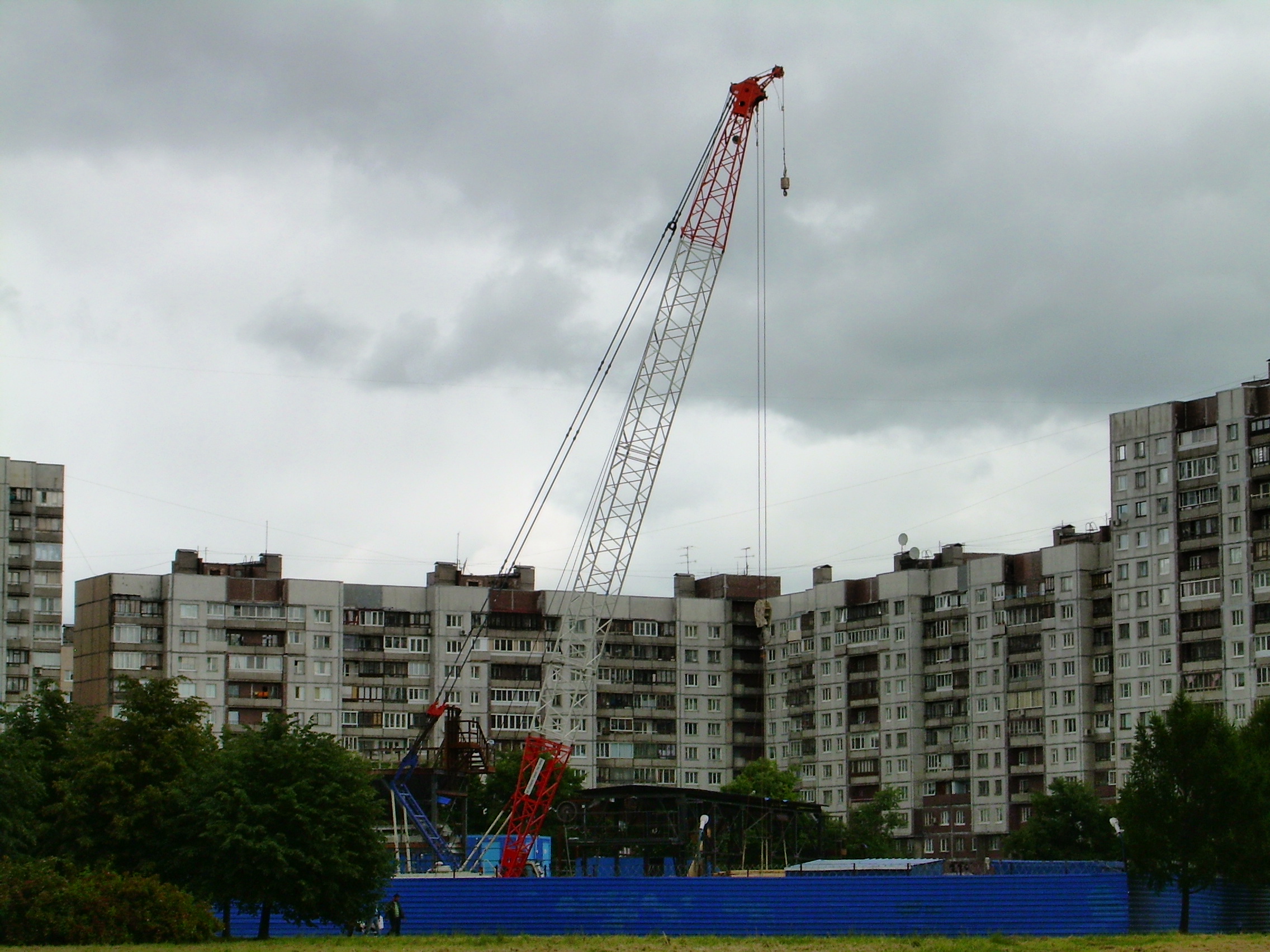 Шумно работает вентилятор воздуходувки(?), на фото его видно справа от нижней красной части стрелы крана. Рядом с забором даже стоять не комфортно. Периодически подъемный кран что-то перемещает по стройплощадке, похоже на пиломатериалы (рассмотреть не удалось, все быстро произошло).