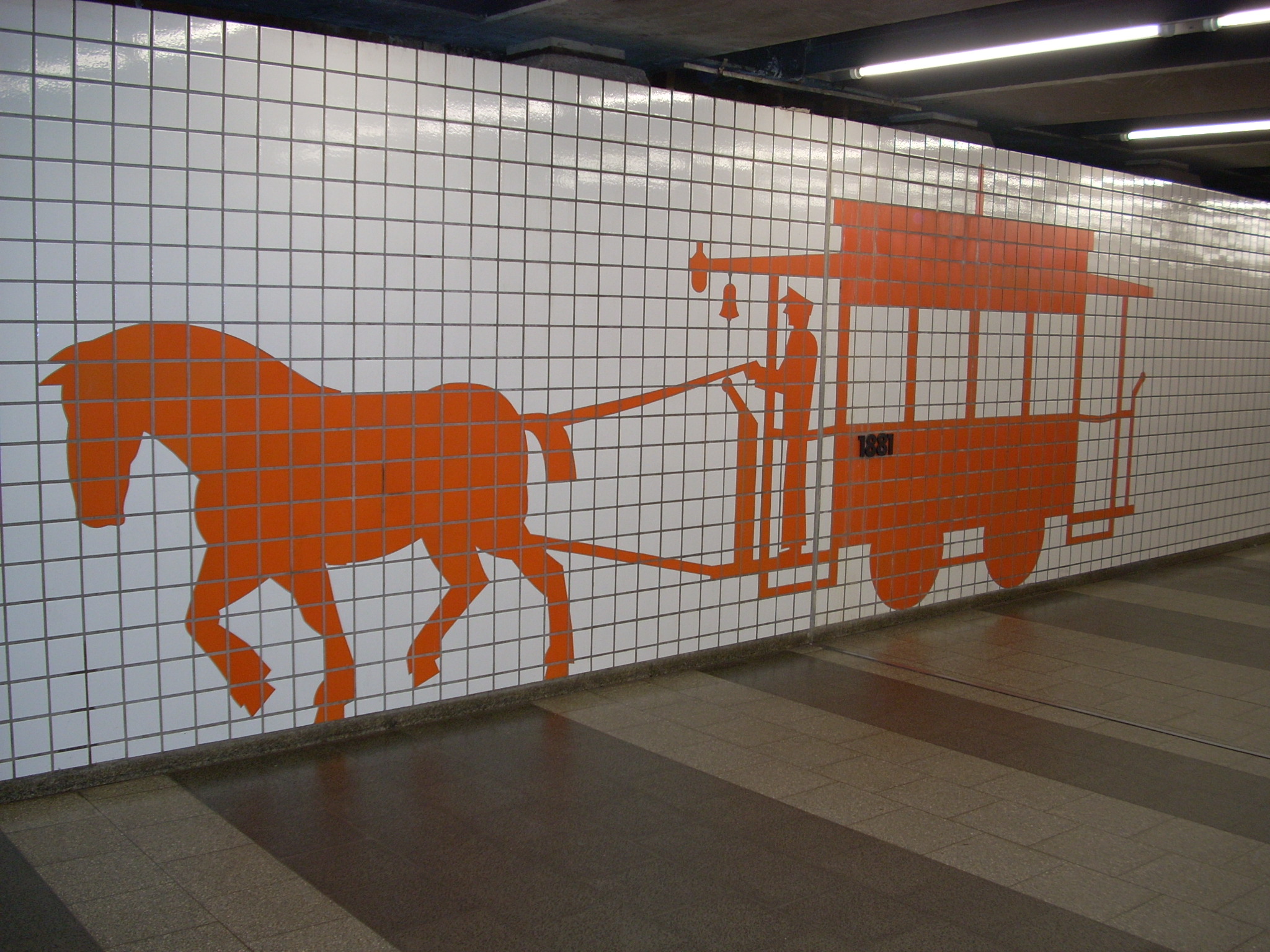 Подземный переход, с которого осуществляется вход на одну из станций. Украшен мозаикой с изображениями трамваев от конки до современных.