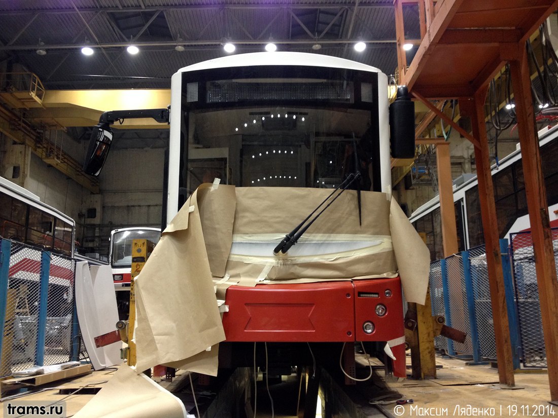 71-407-01 для Санкт-Петербурга. На вагоне установлена тележка с двухступенчатым подрессориванием, ручной контроллер, приводы ЭПРО, шкафы питания и управления также от ЭПРО. Фото сделано в сборочном цехе ОАО "Уралтрансмаш" 19 ноября 2014 г. Автор фото: Максим Ляденко © | trams.ru