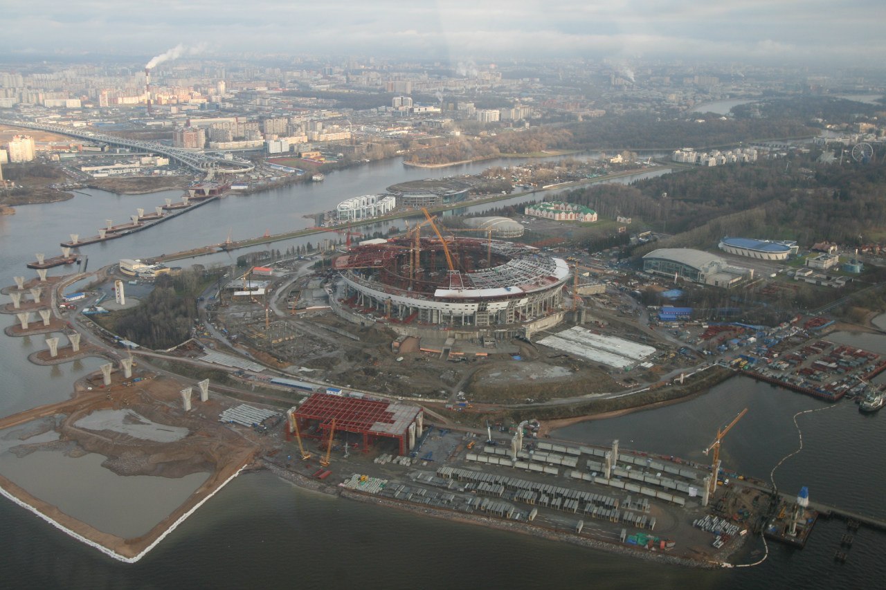 В Интернете появились сделанные с вертолета фотографии различных районов Петербурга. На одном из фото видно, что западнее строящегося на Крестовском острове стадиона появился искусственный земельный участок, частично совпадающий с территорией намыва, который должен быть создан к августу 2015 года.