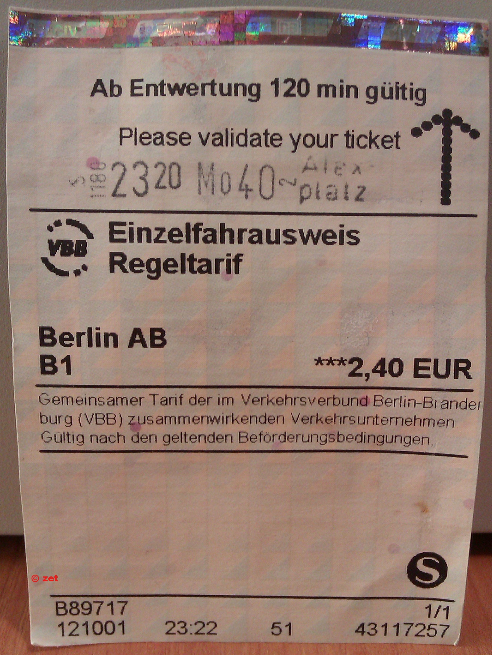 Германия. Берлин. Проездные билеты на общественном транспорте в Берлине едины и действительны для автобусов, трамваев, подземных (U-Bahn) и наземных поездов (S-Bahn) и паромов.