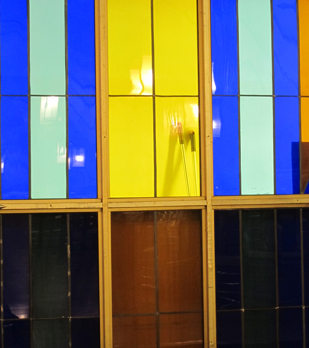 Витраж и правда освещен изнутри полностью, только нижний ряд стекол изнутри зашит какой-то обшивкой, чтобы не был виден метрошный уборочный инвентарь, который там паркуется.