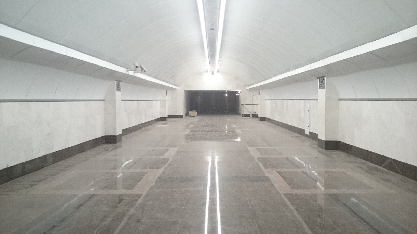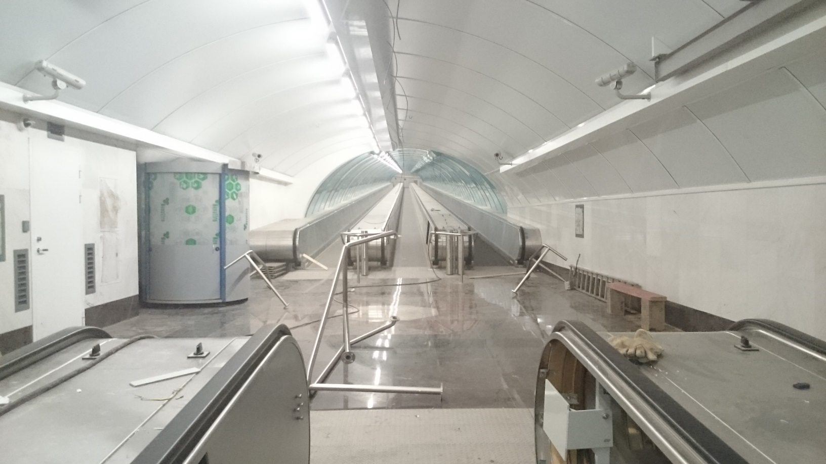 В тоннеле под Невой пока мрак, к освещению ещё не приступили, доделывают ленты траволаторов, с них сняли защитную плёнку, эскалаторы вовсю крутятся.