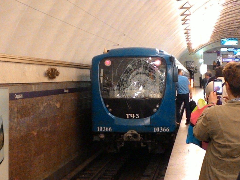 Скорее всего под колёсами не оказался, т.к. луж не было, а у вагона пострадало лобовое стекло.