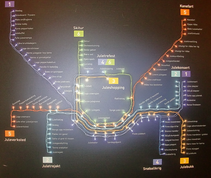 На рождественской схеме метро все названия станций заменены на другие - рождественские, типа "Рождественские покупки", "Праздничный торт", "Снеговики", "Лыжные горки", и т.п.