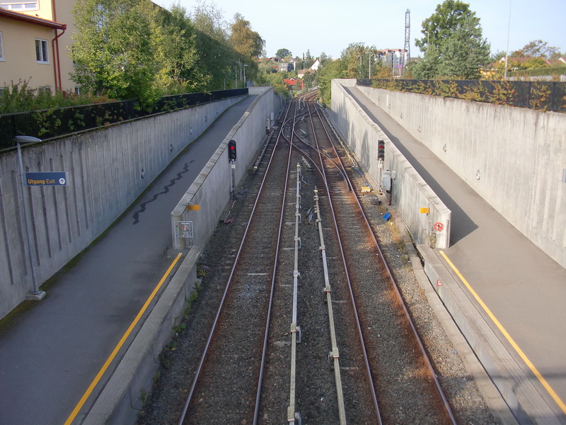 В час пик вдвое увеличено количество поездов на пятой линии со стороны Вэстли. Но каждый второй идёт не по всей линии, а только до Stortinget (между Стуртингетом и Майоштуэном пропускная способность центрального тоннеля ниже), оборачивается там и идёт обратно. Эти поезда прибывают как раз на крайние пути, один из которых изображён на фото.