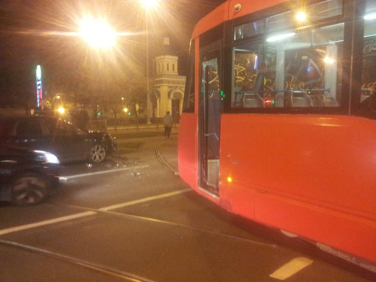 Очевидцы сообщают, что ночью на Московском проспекте произошла авария: иномарка врезалась в трамвай. Бампер у леговушки серьезно поврежден.