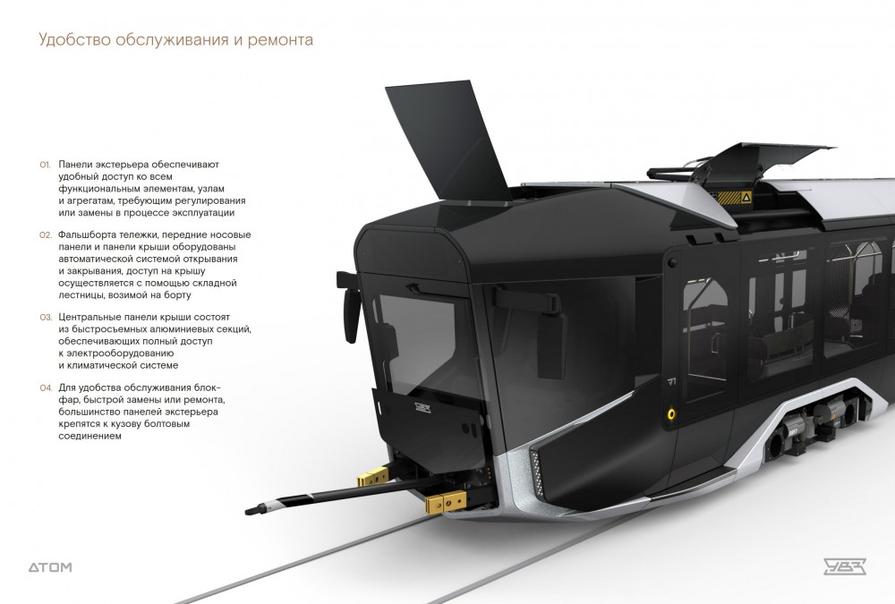 Компоновка поменялась на аналогичную Песе, Альстому, 71-633: крайние секции с поворотными тележками и средняя с неповоротной. Не указываю аналогом 71-931, потому что дверей у вагона всего 4, как и у вышеперечисленных. Коротковатым выглядит для такого количества тележек. Это означает низкую нагрузку на ось, но более высокую цену на единицу длины=вместимости. Сначала подумал, что тележки, судя по форме прохода и диванов, могут быть как раз те самые EVO-УКВЗ-ПК ТС'овские, но на одной из последних страниц pdf'а под открытым бортом видна совсем другая конструкция. Кто может их опознать?