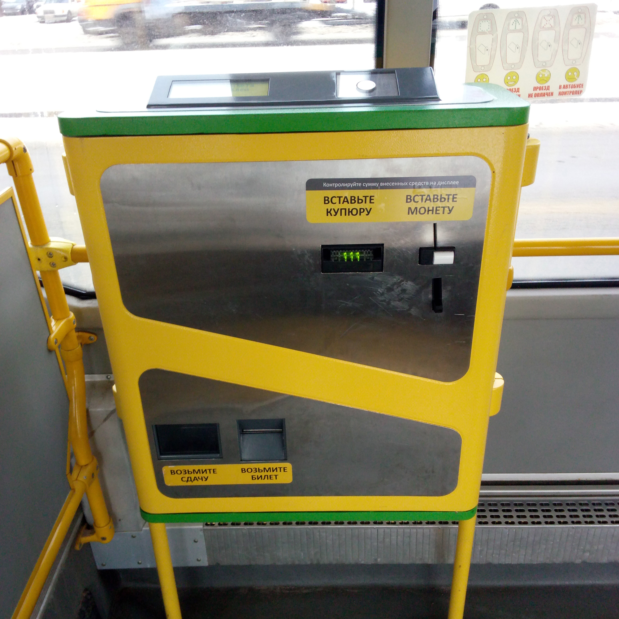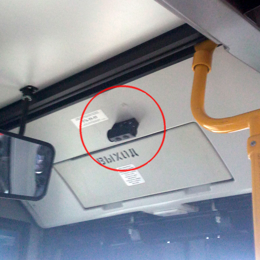А тем временем, дорогие мои мальчики и девочки, в автобусе Колпинского парка, а конкретно - в номере 8109, маршрут 36, заработала новая комплексная система оплаты проезда. Новый убийца профессии кондуктора. Он сочетает в себе новые зелёные валидаторы улучшенного дизайна, за который теперь даже не стыдно, выдающий сдачу кассовый аппарат на средней накопительной площадке и даже счётчики захода/выхода пассажиров над каждой дверью (ну, это если я правильно понял назначение этих маленьких камер, мобилофото которых приводится ниже). Более того, проезд можно также оплатить при помощи мобильного телефона, скачав соответствующее приложение (после оплаты оное приложение выдаёт уникальный QR-код на экран телефона, а зелёные валидаторы снизу имеют сканер этого самого QR-кода).
