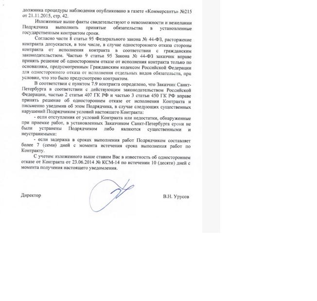 Уведомление датировано 1 декабря этого года. По закону, оно вступит в силу спустя 10 дней после вручения генподрядчику, если «Трансстрой» не представит в комитет убедительного подтверждения своей добросовестности.