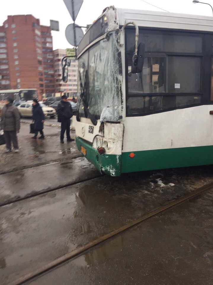 На перекрёстке проспектов Стачек и Трамвайного столкнулись два рейсовых автобуса — № 200 и 300. (Столкновение 5329 и 5250).